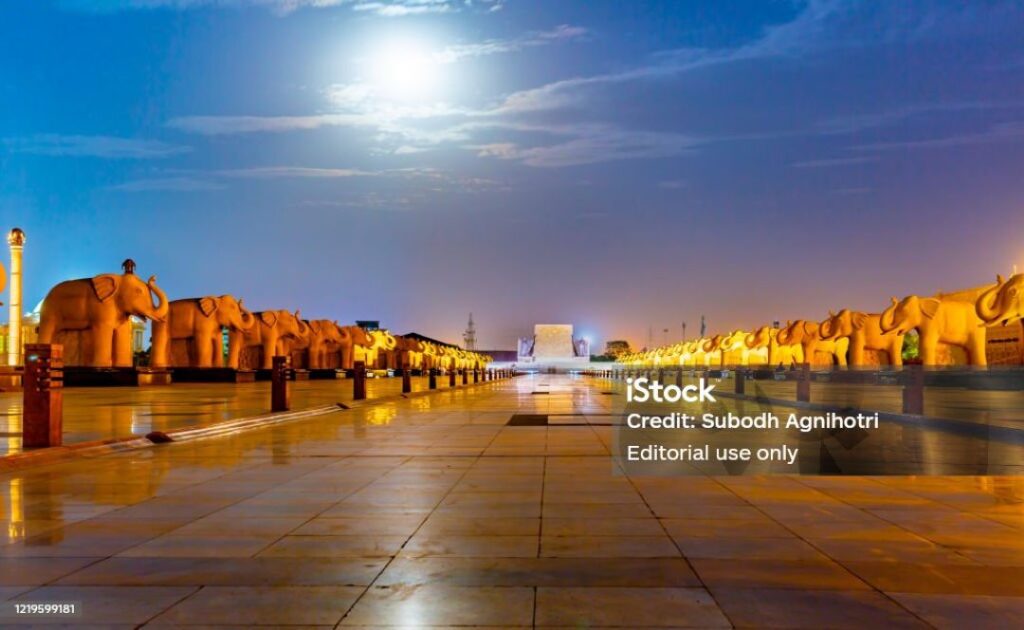 प्रवेश द्वार और हाथियों की कतार – पार्क के दोनों ओर लगे हुए सैकड़ों हाथियों की मूर्तियाँ शक्ति और संरक्षण का प्रतीक हैं।